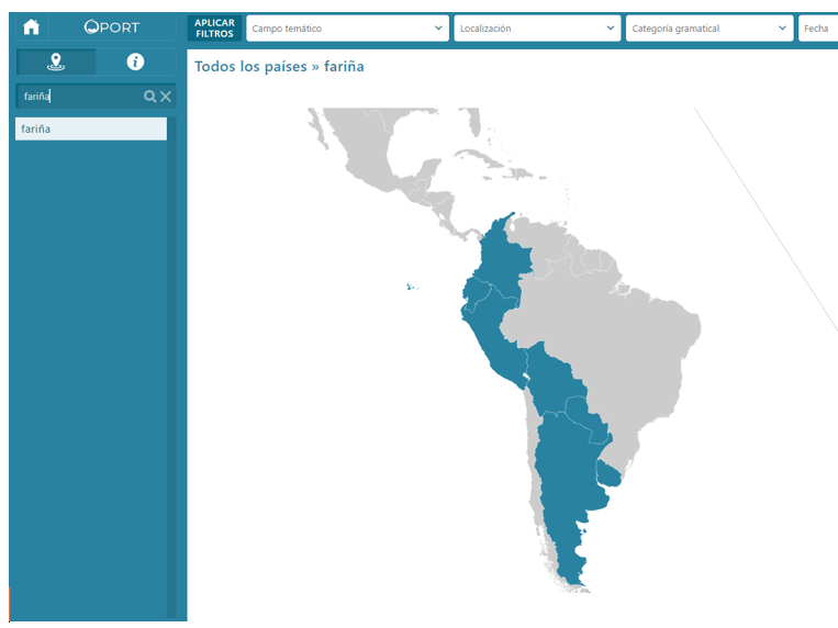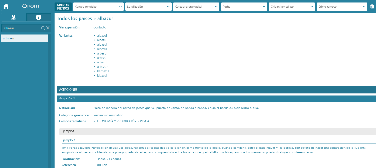 [16] En ocasiones, en cambio, es posible documentar el origen portugués de una zona concreta, por ejemplo, del portugués de Madeira, de manera que se tienen en cuenta estas localizaciones a la hora de indicar la procedencia geográfica del étimo. Así incorporamos el filtro de búsqueda portugués dialectal, que permite recuperar voces como alicayota, aljaba, aljaraz, amarujo, birollo, fajana, garúa, etc., o, más específicamente, la localización del portugués madeirense, por su significativa aportación a algunos campos, como se comprueba en el registro de bagacera, batidera, bubango, etc.