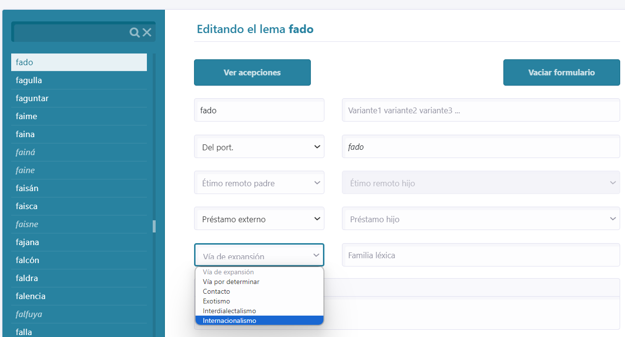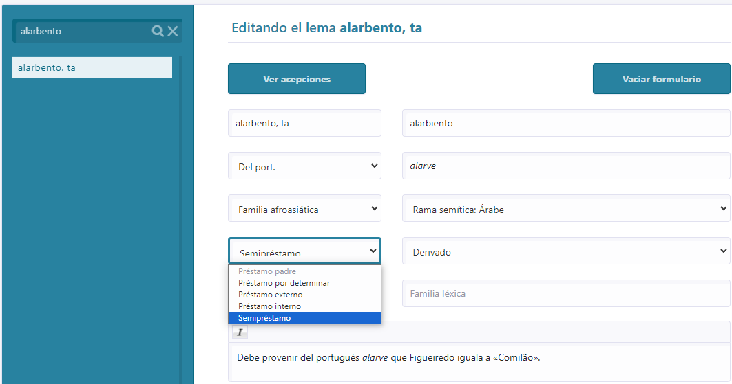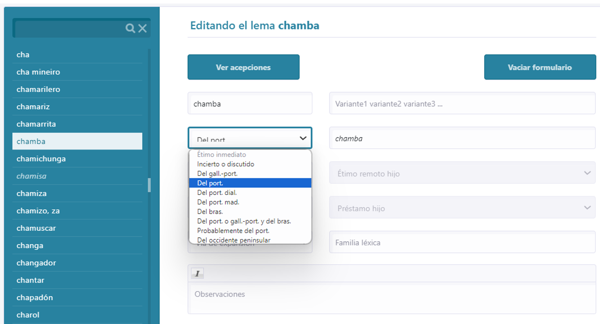 [9] La determinación del origen no es siempre sencilla, pues son varias las posibilidades que se suman a la adopción directa desde el portugués estándar (étimo inmediato). Se abre, así, un abanico de opciones etimológicas que contempla todos los orígenes constatados con étimos inmediatos, tal como se puede apreciar en la interfaz de edición (fig. 2). Las opciones son, en este caso, las siguientes: del gallego-portugués, del portugués, del portugués dialectal, del portugués madeirense, del brasileño, del portugués o gallego-portugués y del brasileño, probablemente del portugués y del occidente peninsular.