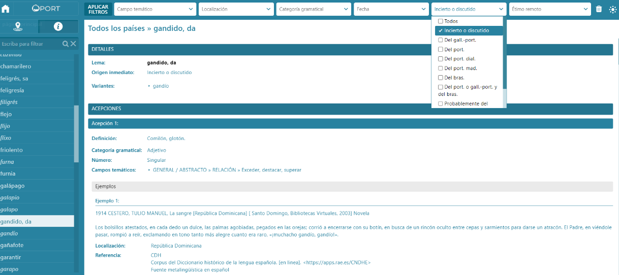 [10] El origen incierto o discutido se da en un buen número de voces para las que los especialistas no han llegado a una solución concluyente. Así ocurre con un grupo de las registradas en OPORT, como, por ejemplo, bernegal, chamarilero, feligrés, flejo, furnia, etc., que pueden obtenerse en la aplicación web mediante el correspondiente filtro, como vemos con la voz gandido, -da (fig. 3).