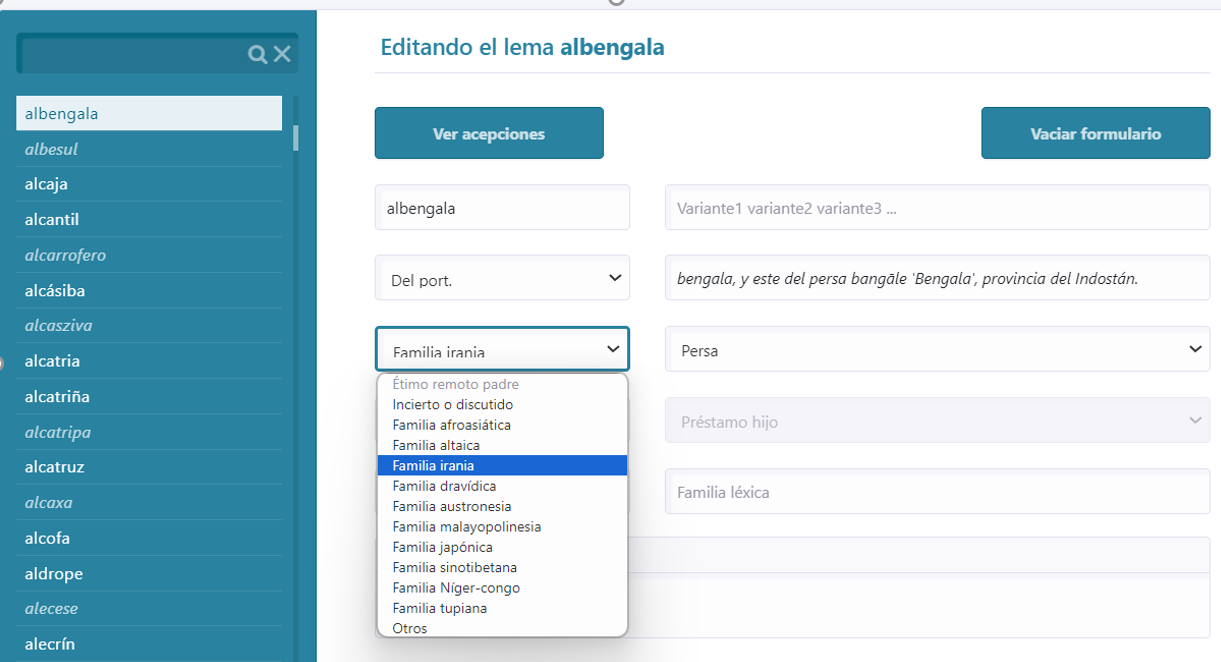 [31] Con tal finalidad, la aplicación ofrece un primer análisis de los datos que presenta. Desde el punto de vista lexicográfico, se aportan definiciones de las acepciones documentadas, con su marcación de uso correspondiente en los casos en que es posible determinarla. El análisis de la historia de la palabra, por otra parte, presenta las etimologías seguras, pero también aquellas de las que solo se ha podido comprobar un origen probable o dudoso. De esta manera, se proporciona material para nuevas investigaciones sobre la historia de estos préstamos.