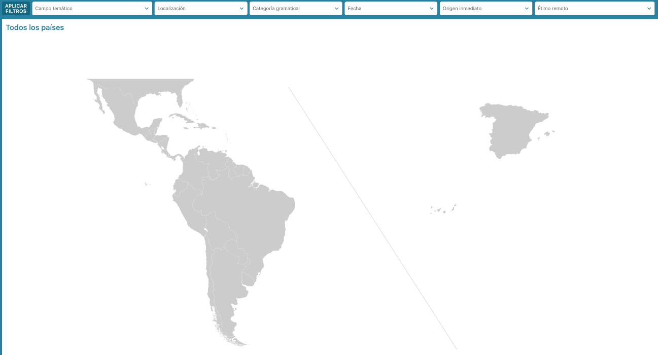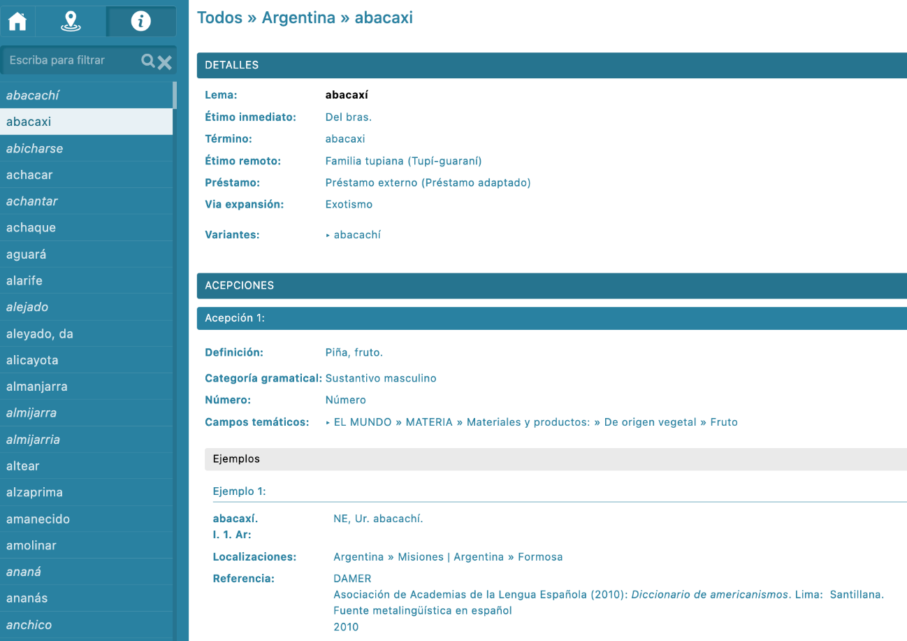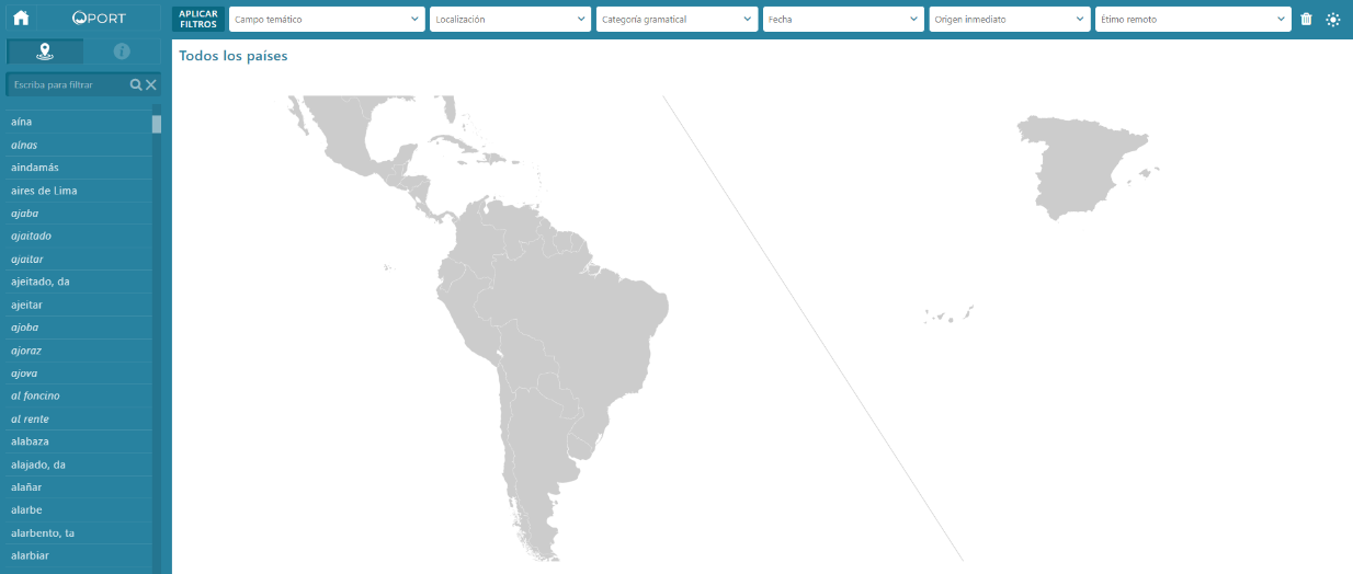[26] En el estado actual del proyecto, se han habilitado seis tipos de filtros que permiten rescatar la información de cada entrada atendiendo al campo temático, la localización geográfica, la clase de palabra, la fecha de documentación, el origen inmediato y la lengua de origen remoto.