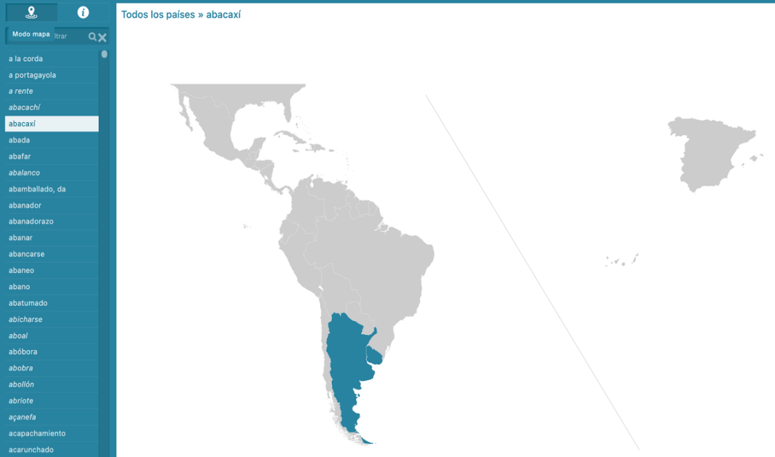 [23] La representación de la extensión geográfica de la voz aparece, por defecto, por países; así se observa, por ejemplo, en el brasileñismo abacaxí, documentado en Argentina y Uruguay (fig. 9), pero también es posible ver la extensión que tiene dentro de cada país, de manera que se constata que el uso de esta voz en Uruguay se registra en las áreas fronterizas con Brasil: Rivera, Tacuarembó, Cerro Largo, Treinta y Tres y Rocha (fig. 10).