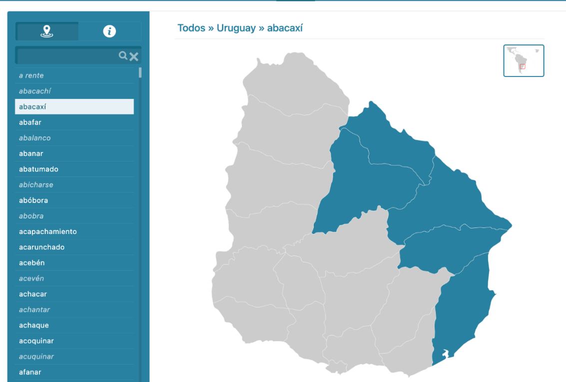 [28] La localización geográfica de las voces está basada en los códigos ISO de los países y, dentro de cada uno de ellos, en la demarcación política correspondiente, de manera que la selección en el menú desplegable de, por ejemplo, Uruguay permite la selección de las voces documentadas en cada uno de sus 19 departamentos, lo que hace posible estudiar la presencia concreta de préstamos en todo el país o bien en las áreas más próximas a la frontera con Brasil, como veíamos en el ejemplo de abacaxí (fig. 10), que se registra en los departamentos uruguayos lindantes con el país vecino.
