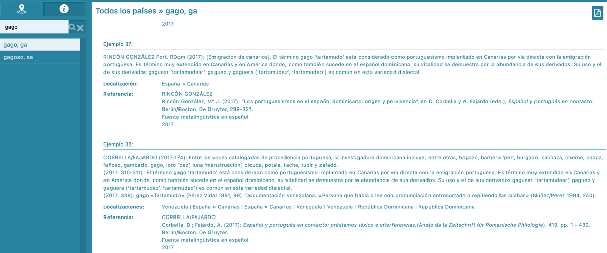 [25] Las atestaciones de uso pretenden no solo orientar en el empleo del préstamo, sino también dar prueba de su distribución geográfica y de su presencia en distintas épocas, de ahí que el número de testimonios aportados suela ser elevado, como en la entrada gago (fig. 12), que aporta 38 ejemplos.