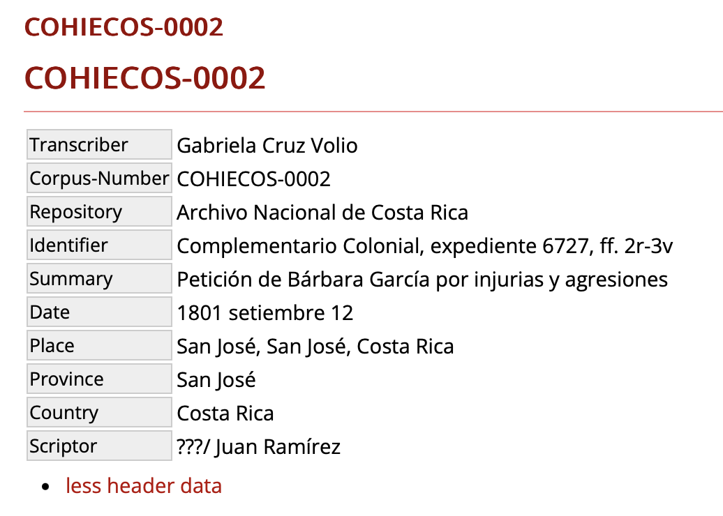 COHIECOS = Gabriela Cruz Volio (ed.) 2020-. Corpus histórico del español de Costa Rica. Universidad de Costa Rica. https://teitok.ucr.ac.cr.