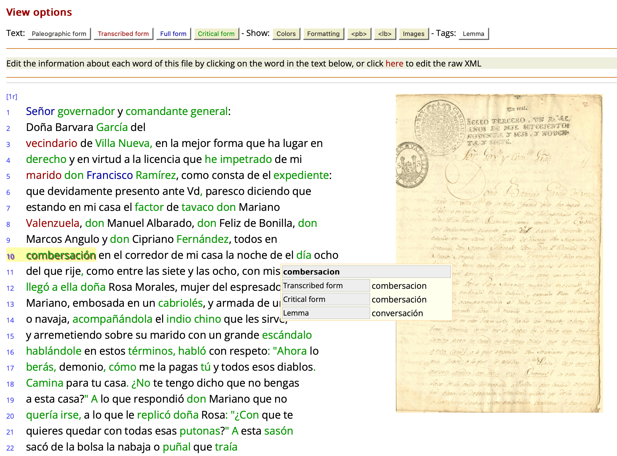 En la figura 7 se ha seleccionado la visualización de la presentación crítica (critical form), de modo que las formas editadas aparecen en color verde. Las formas marcadas con rojo corresponden a palabras que tienen una ruptura a final de línea, pero que en la visualización de formas transcritas (transcribed form) aparecen sin ruptura. Por otro lado, las formas en azul (full form) son abreviaturas que han sido desarrolladas. Al posicionar el cursor sobre cualquiera de estas formas se abre una ventana emergente en donde se muestran los niveles de edición, como la forma transcrita paleográficamente y la forma editada críticamente, como puede verse en la figura 7 con el ejemplo de la forma transcrita combersacion y su respectiva forma crítica combersación. Después del proceso de lematización y de anotación morfosintáctica, esta información también aparecería allí, pero esto corresponde a una etapa más avanzada. Por ahora se agregó manualmente el lema de la palabra conversación para mostrar esta posibilidad de codificación y de visualización en TEITOK.