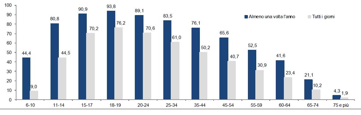 [3] A tal proposito, i dati dell'ISTAT (2014) documentano che, pur essendo ampia la porzione di parlanti esclusa dai servizi telematici, tutte le classi di età hanno accesso più o meno diffuso alla rete informatica e, come evidente nella figura 1, sono soprattutto gli adolescenti e i giovani a servirsi di internet e dei suoi servizi.