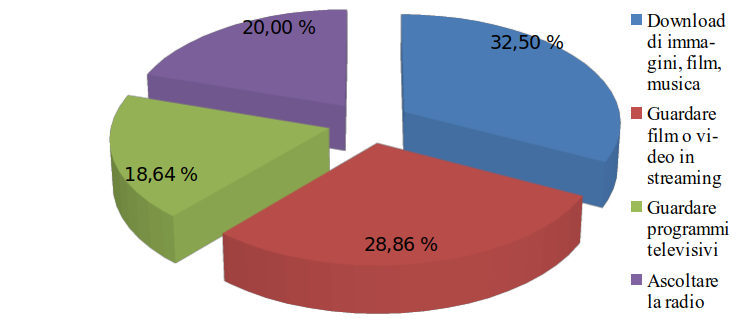 [4] Il rapporto ISTAT (2014) sottolinea, inoltre, come la rete sia diventata importante per la diffusione di contenuti audio e video. In particolare si delinea la situazione rappresentata nella figura 2: la tendenza generale è legata alla fruizione di prodotti audiovisuali con il download o la semplice ricezione di musica, film e video.