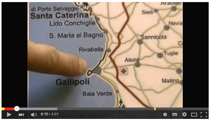 [17] I riferimenti alla diatopia salentina emergono attraverso l'uso di toponimi in dialetto come Nòule 'Novoli', Cisaria 'Santa Cesarea Terme', Caddripuli 'Gallipoli'; ma anche Nardò e Rivabella che non sono utilizzati nella loro variante dialettale. Si fa ricorso in soli due casi alla micro-diatopia locale con la citazione di alcuni luoghi ricreativi, simbolo della vita notturna salentina: i locali da ballo Quartiere Latino e Guendalina. Questo accade nella clip de La caduta dove, per rinforzare la dimensione spaziale del dialogo, si assiste a un ri-editing con l'aggiunta di un frammento (figura 3) contenente una carta topografica e l'indicazione delle località oggetto dello scambio comunicativo.